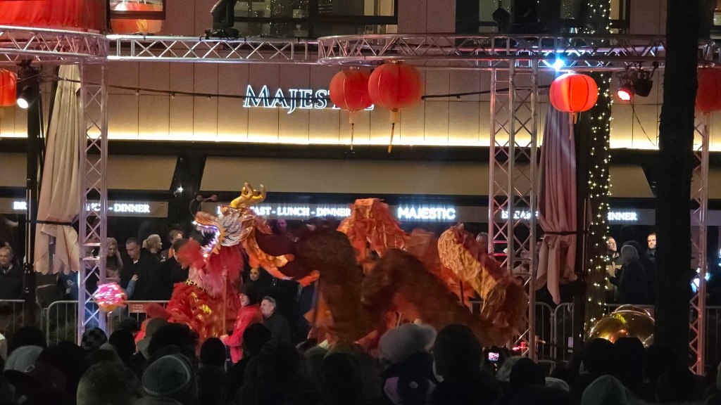 Then fireworks! Drums! Lion dancers and dragons! A giant sign unfurled down the side of a building! In the middle of the city, quite by accident, we had stumbled into a Lunar New Year celebration.