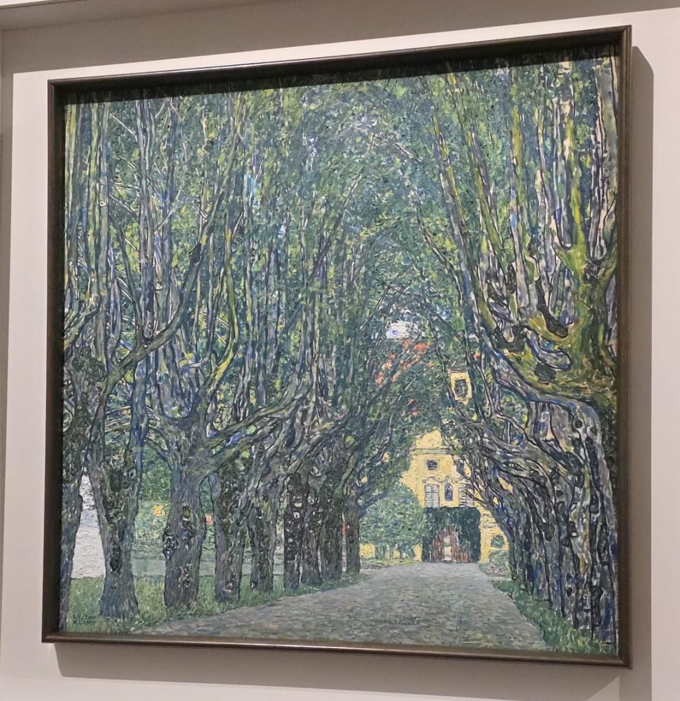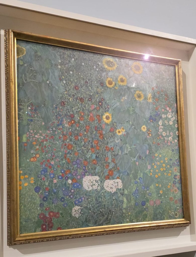 From this gallery, which featured other interesting and engaging impressionistic artwork, the next room moved onto Klimt and landscapes. While some of his landscapes seem to capture movement and feeling in the same way that may echo Van Gough to a viewer, the ones I am most drawn to are his zoomed-in landscapes. Rather than wide, pastoral scenes, he focuses on the close details, creating an almost abstract riotous mosaic of colors. Unlike most canvas’ you will find displayed here or at any museum, he tends to use a square format, and the zoomed-in paintings (some of which he used a telescope for) do not feature sky or horizon.